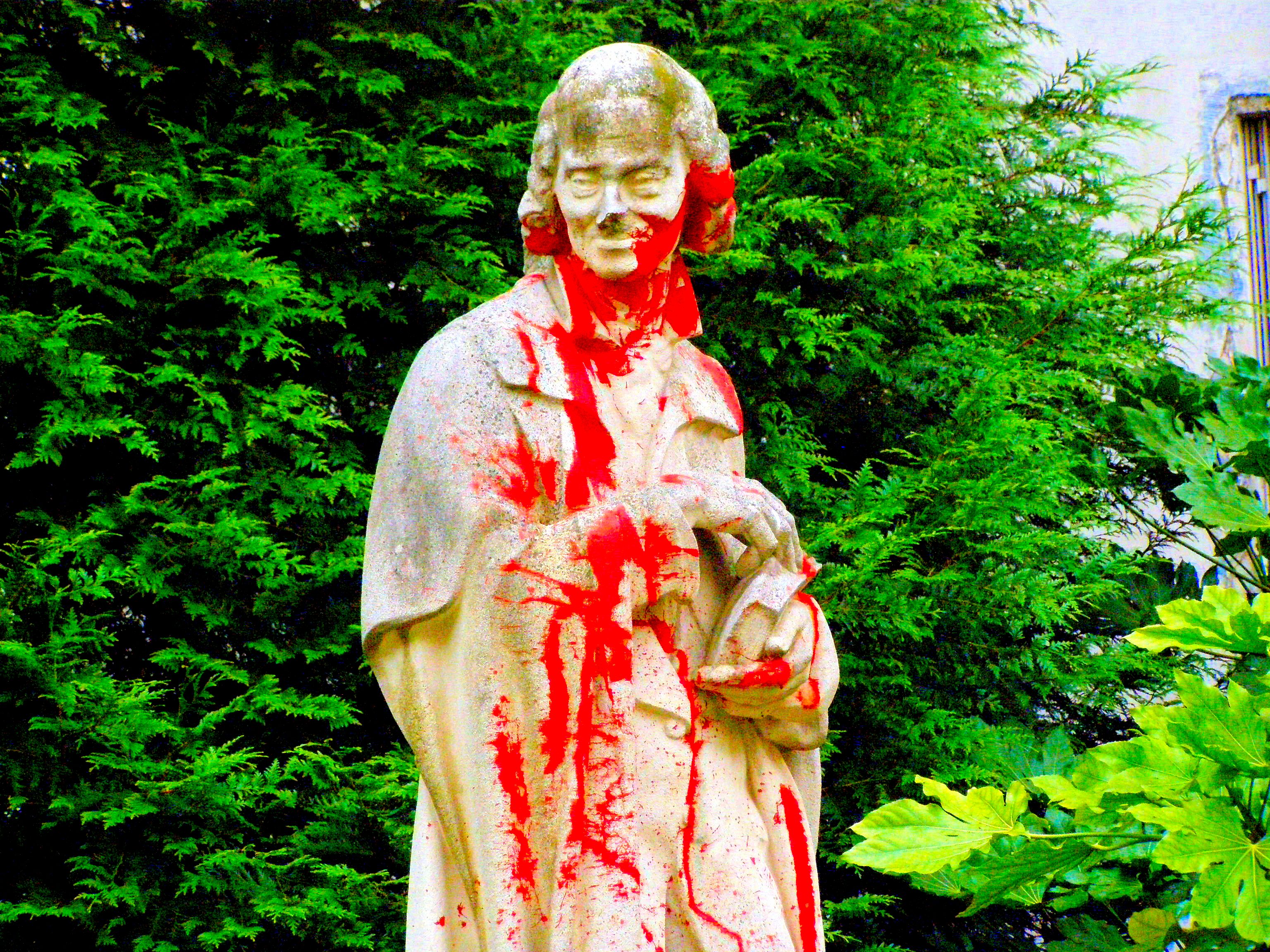 The philosopher does indeed have a somewhat philosophical, or possibly bemused, look on his face. One almost has the impression that he’s gazing at the perpetrator of this outrage. https://witness.theguardian.com/assignment/5527b194e4b0aef4615dc629/1470716