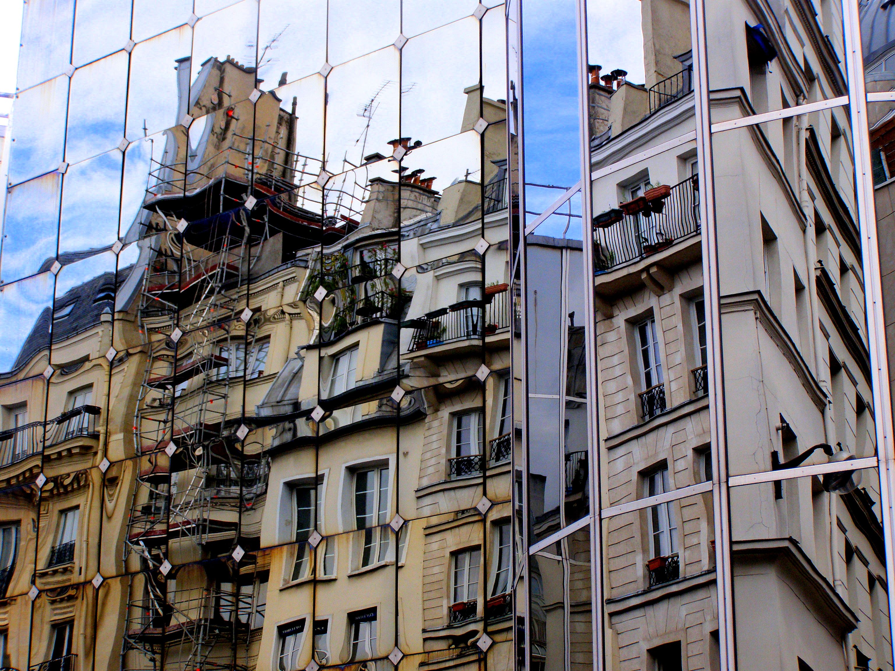 Walking in Rambuteau, Paris, where each new building, clad in mirrored panels, appears to be a distorted, reverse copy of the old building opposite. This is one of three photos taken one minute apart