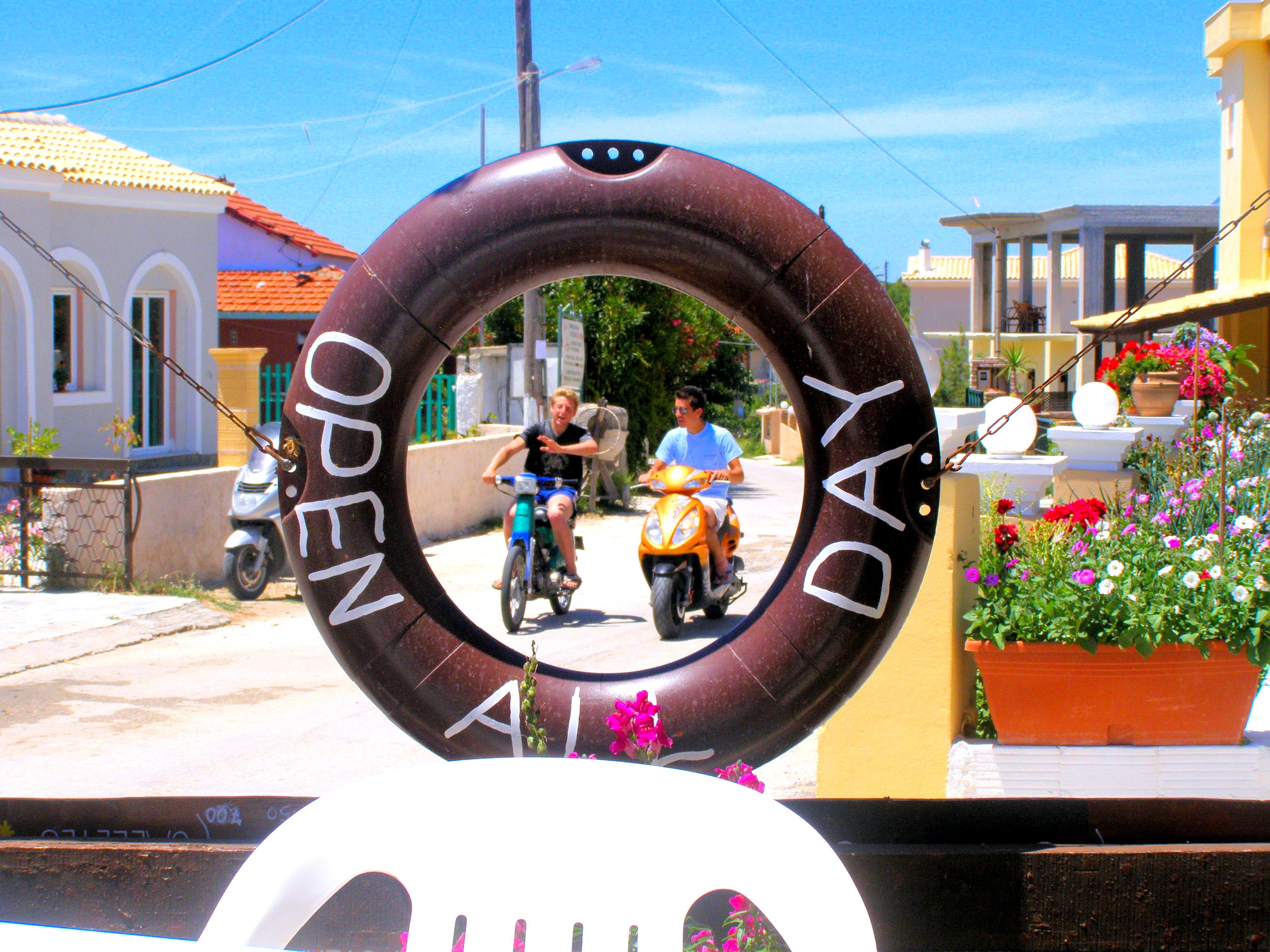 I was spending a day at Agios Georgios (Saint George’s Beach) in Corfu. Mid-afternoon, I walked up to the main road to have a coffee. I was amused that the words, ‘Open All Day’, were facing inwards rather than outwards. I saw the daredevils approaching and decided to frame them for something they hadn’t done.