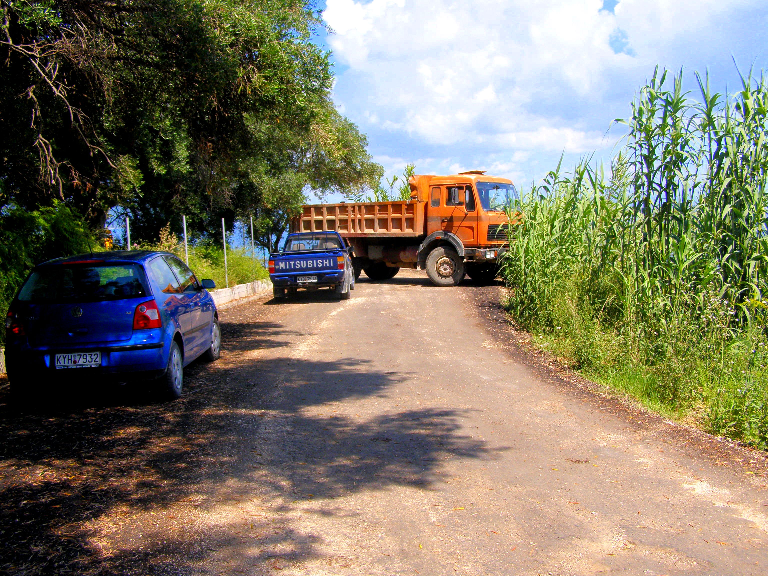A landslide had caused the road to fall away towards the beach below. I climbed over the landslide and under this lorry, which had been placed there to stop traffic. When I looked back to take the photo, it looked as though the lorry had skidded and slid into that position.