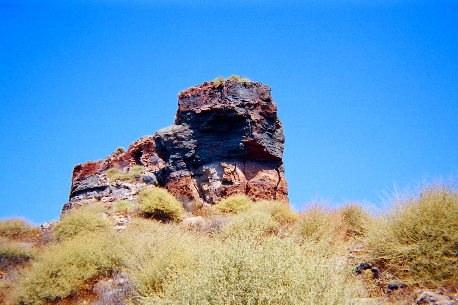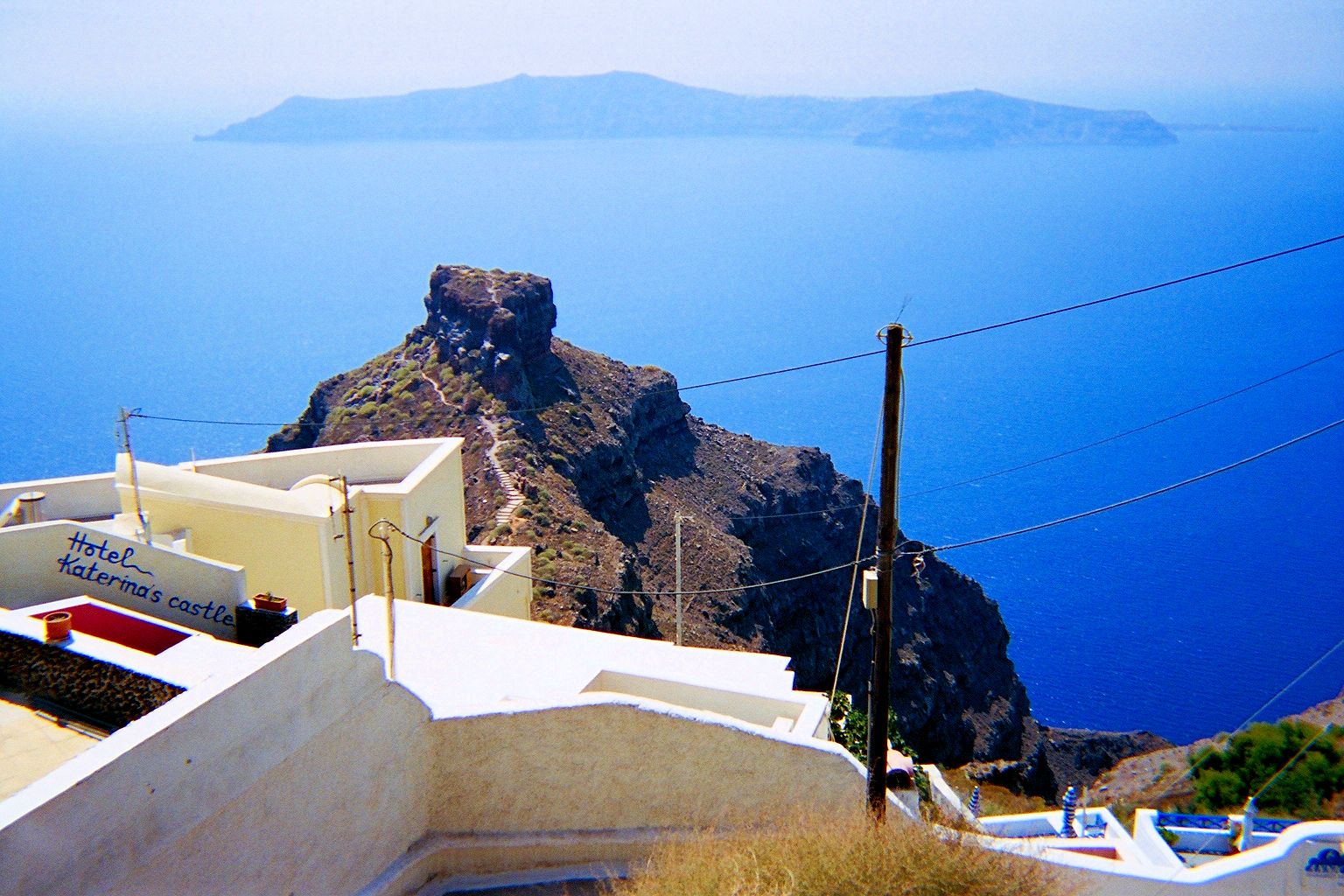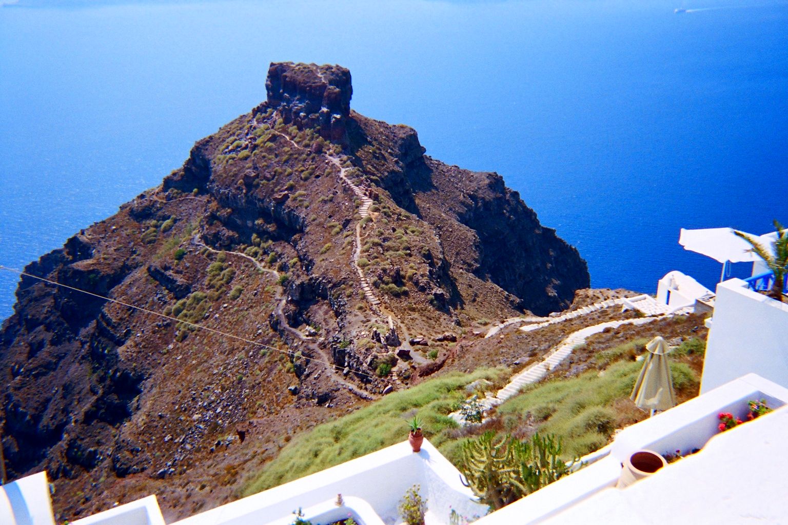 Imerovigli. The day was hot; hotter than any I could remember. It seemed as though I was buying an iced drink at every shop I passed. I turned left and staggered down a shaded alley. Maybe there was a way to the beach. Water warm but cooler than the sun. I saw the rock. I didn’t know it then but I was gazing at Skaros. What a fool I was. With the gods but without a camera. Well, not entirely without. I’d picked up a disposable camera on my way up the hill. Now, thankfully, the way was down.