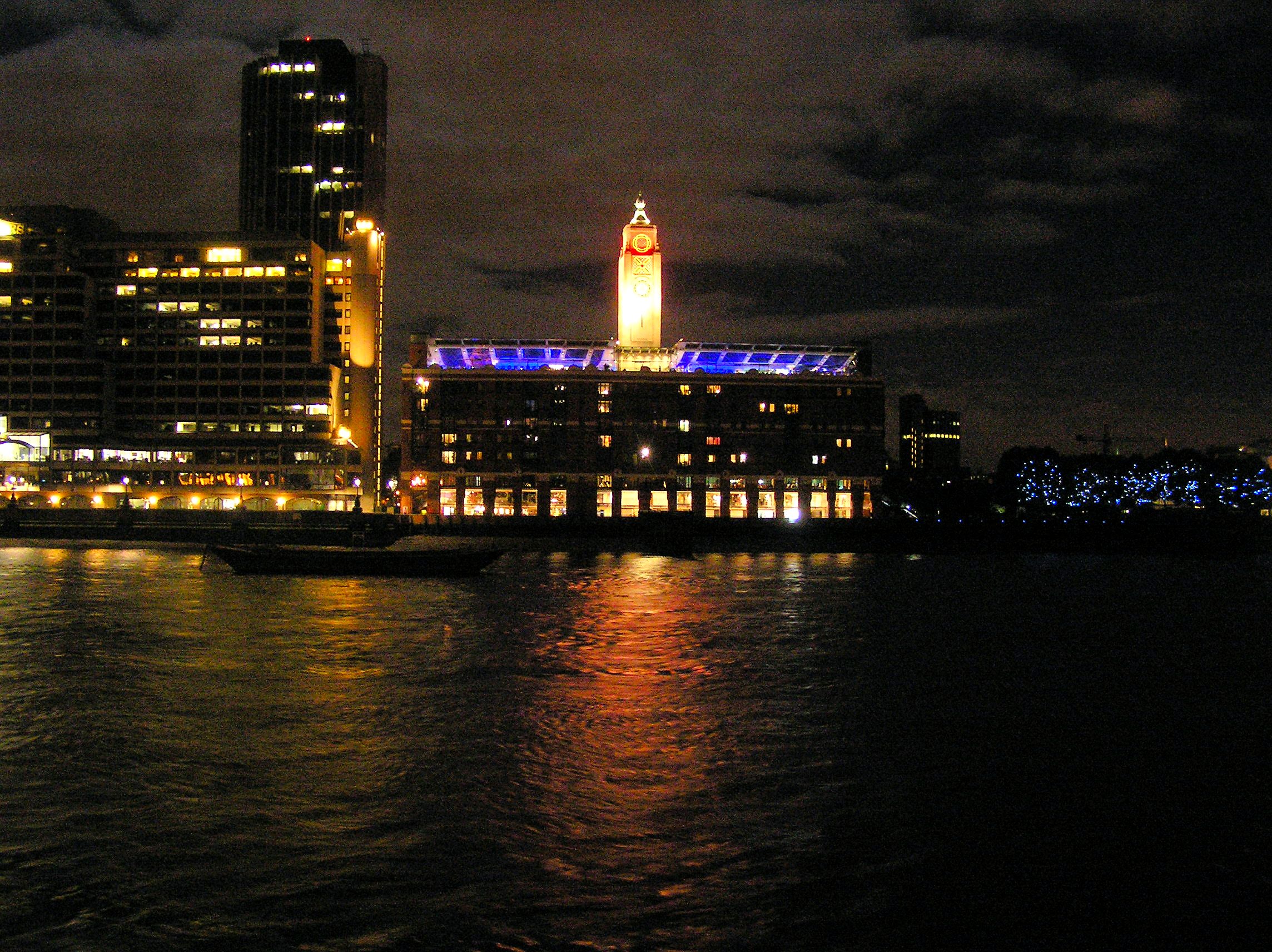A night voyage past the Oxo Tower on the south bank of the River Thames in London